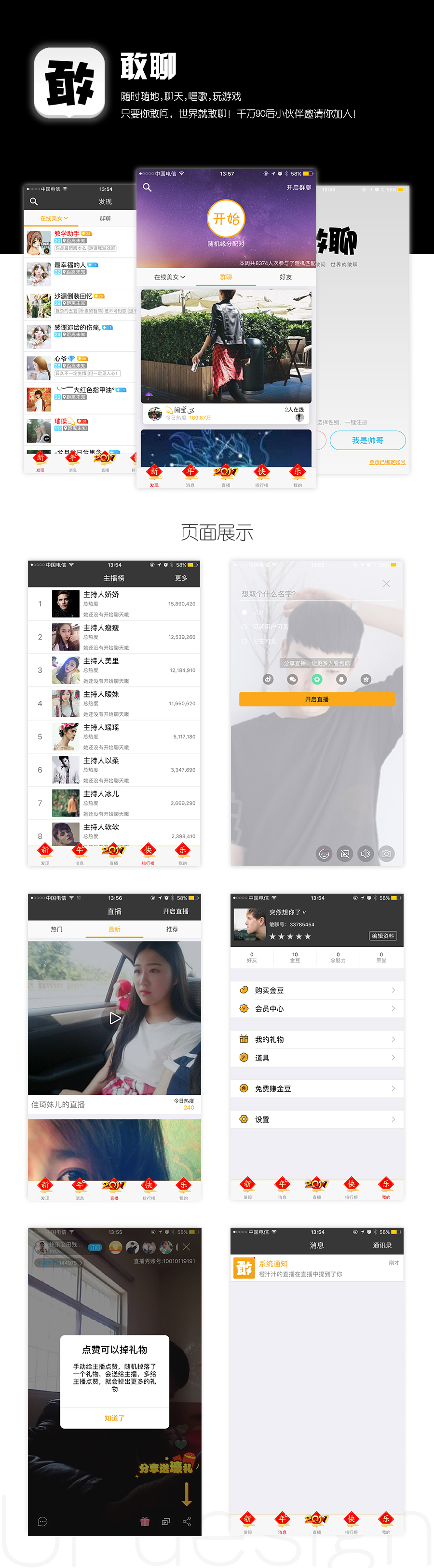 只要你敢問,世界就敢聊!千萬90后小伙伴邀請你加入!在這里你可以:l隨時隨地與男神、女神無節操真心話大冒險!l爆嗨秀場,與人氣主播聊天、唱歌、玩游戲歡樂不停!